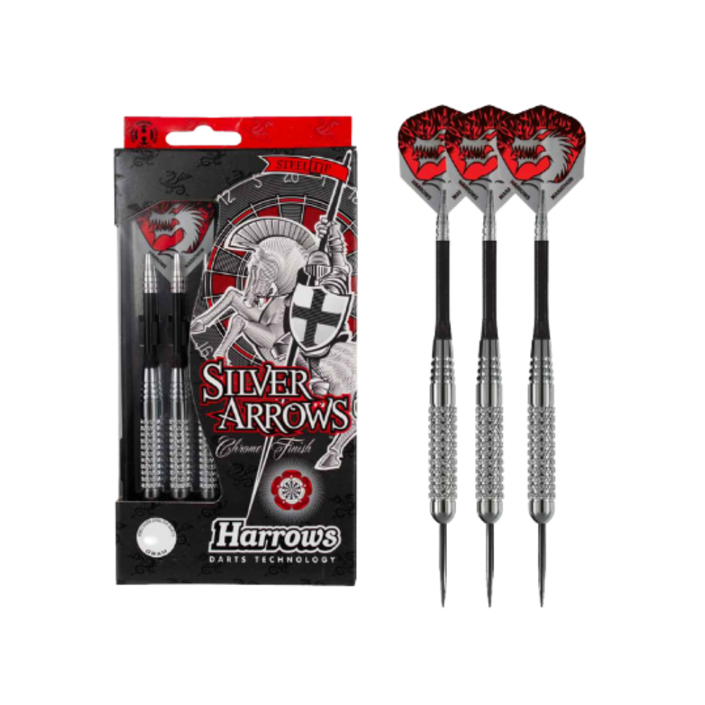 The Harrows Silver Arrows darts are ideal for players of all levels. The GR model offers the 22GR, measuring 54 mm in length and 8.4 mm in diameter. Equipped with Alamo shafts for increased stability and Marathon 1529 flights for better control, these darts are sold in sets of three, making them perfect for enhancing your game.