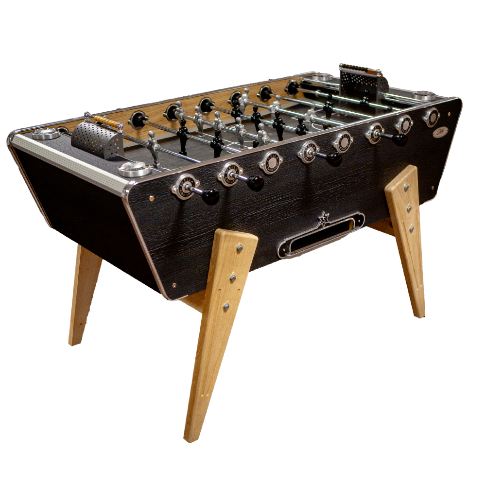The Carbon Foosball Table combines modernity and authenticity with its elegant design and new decorative surface. Inspired by contemporary lines, it stands out with a wooden structure enhanced by a burnt-wood effect finish, delivering a bold aesthetic and a unique character. Its futuristic yet sophisticated look makes it both a piece of art and a game, perfect for enthusiasts of style and performance.