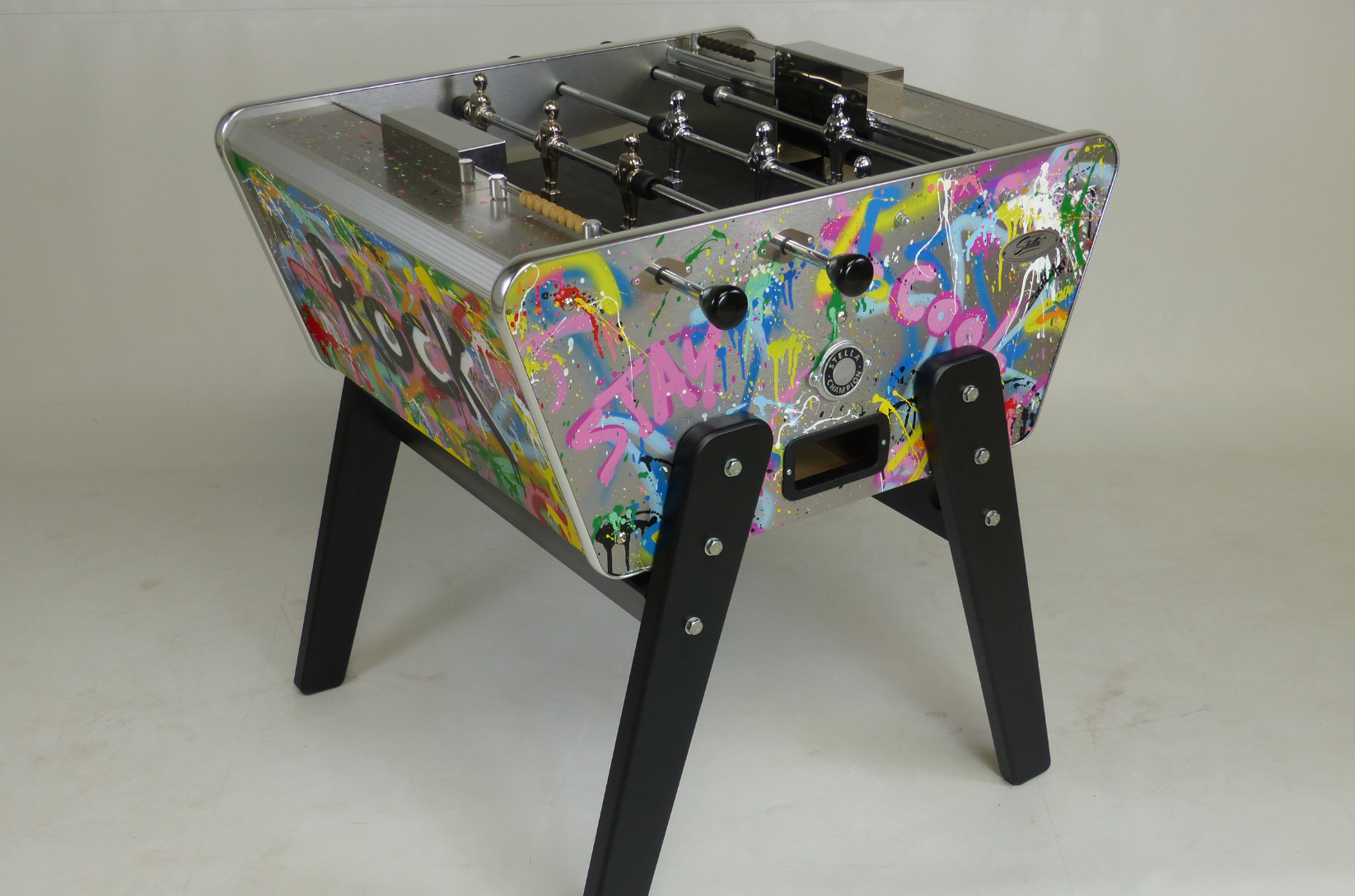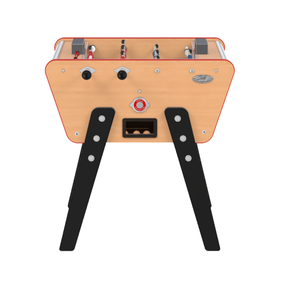 Les pieds du Toi&Moi sont en hêtre massif, un bois dur, esthétique et résistant que nos menuisiers vont travailler et peindre à la main dans nos ateliers. Un concentré de qualité très appréciable, que l’on retrouve à travers nos larges barres de baby-foot. Vous bénéficierez de finitions dans les détails : Fixation des paliers à l’aide de losanges décoratifs Stella en inox, longs compteurs de points placés à côté des buts, mais aussi profilés d’angle derrière les buts en aluminium anodisé en font un petit baby qualitatif et décoratif.